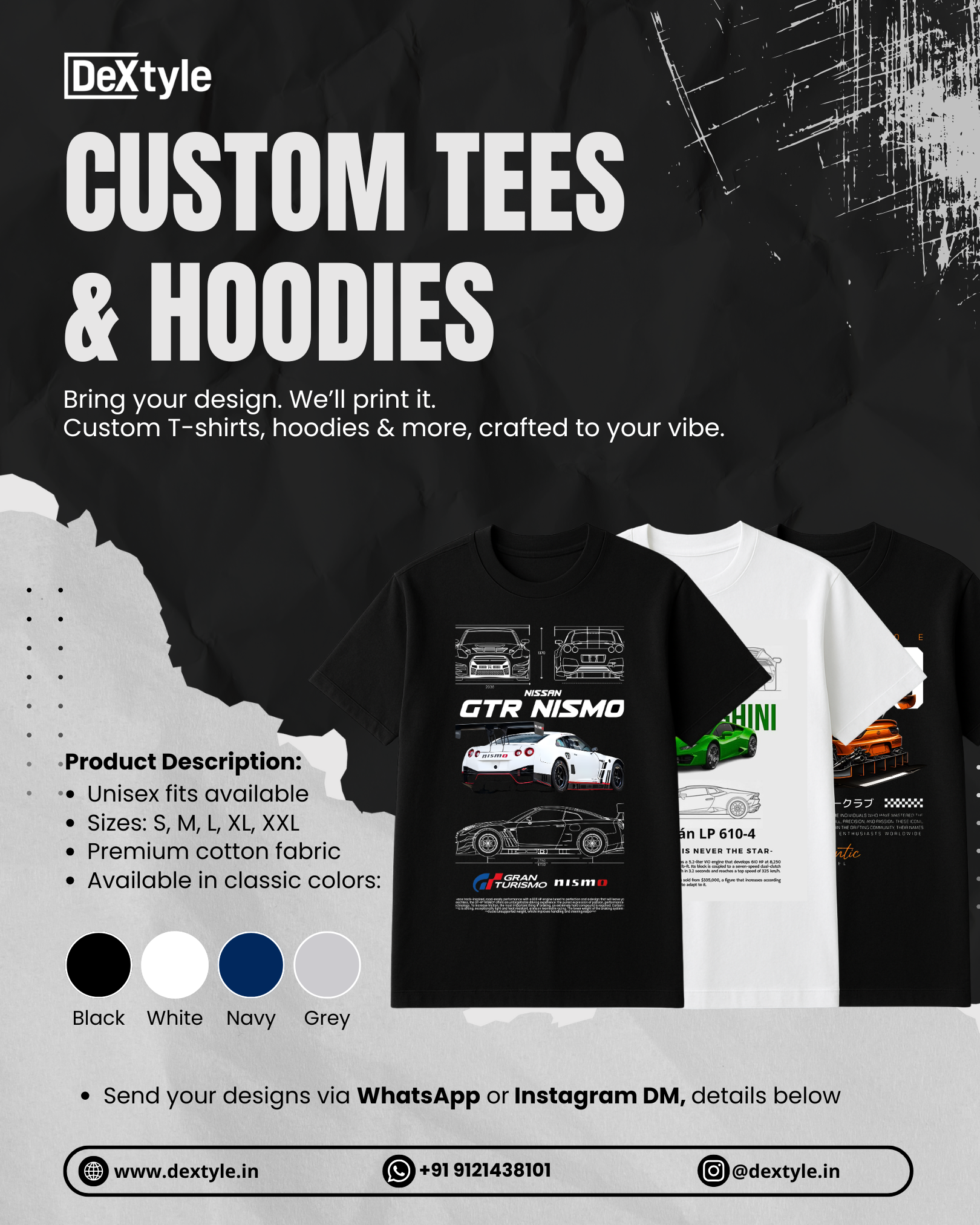 You’ve got a design you vibe with and want it on a tee or hoodie? We’ve got you. We offer custom apparel printing — no minimum quantity. DM us via WhatsApp or Instagram. Contact details shown in image.